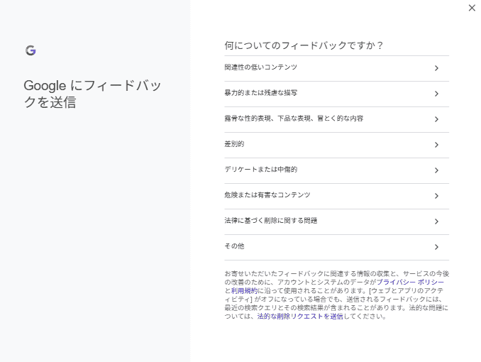 Googleではガイドラインに違反する内容に該当する場合、公式フォームから申請を受け付けています。