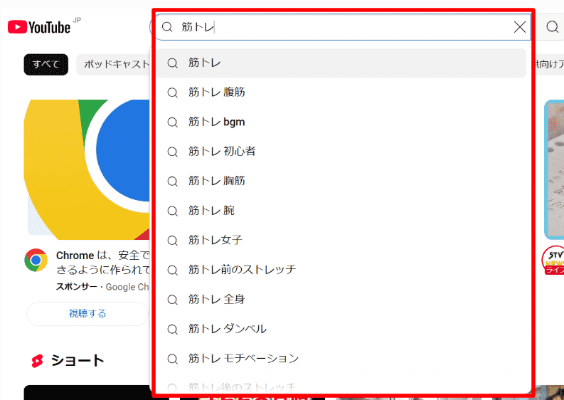 一方、YouTubeで「筋トレ」と入力すると、「筋トレ 腹筋」「筋トレ 女子」「筋トレ 初心者」など、視聴者がよく探す動画テーマが表示されます。