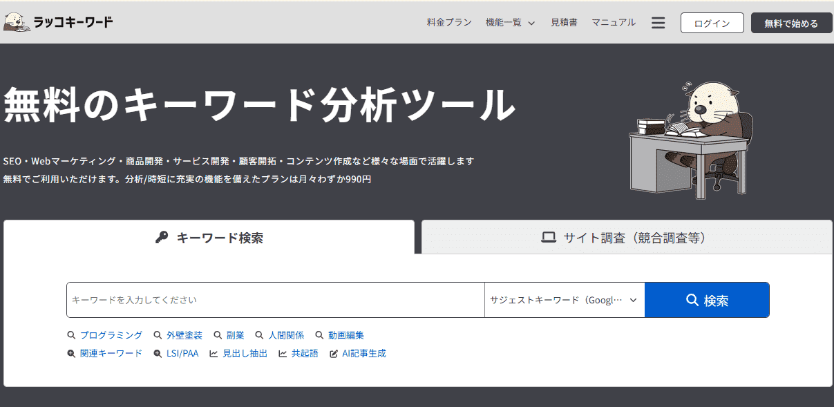 ラッコキーワード」は、無料で利用できるキーワードリサーチツールで、Google・Bing・YouTube・Amazonなど各プラットフォームのサジェストキーワードを一括取得できます。