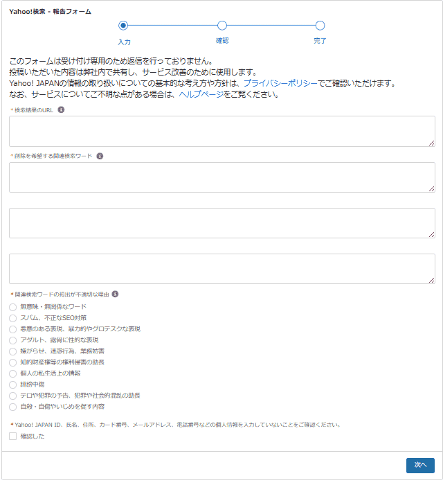 Yahoo!のサジェスト削除は、公式フォームから申請できます。