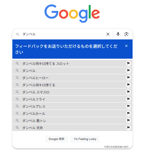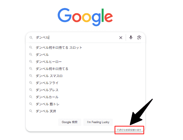 サジェスト一覧の右下に表示される「不適切な検索候補の報告」をクリックします。