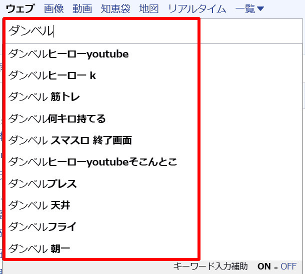 例えば「ダンベル」の検索結果からは、筋トレ種目や関連動画、特定コンテンツに関する検索が多いことが示唆されます。Yahoo!では、多数のユーザーが知りたいと考えているテーマの傾向を予測し、その結果をサジェストとして表示しています。
