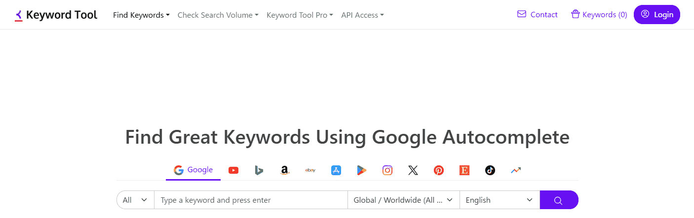 Keyword Tool」は、GoogleやYouTube、Bing、Amazon、Instagramなど、さまざまなプラットフォームのサジェストキーワードを一括で取得できるキーワードリサーチツールです。