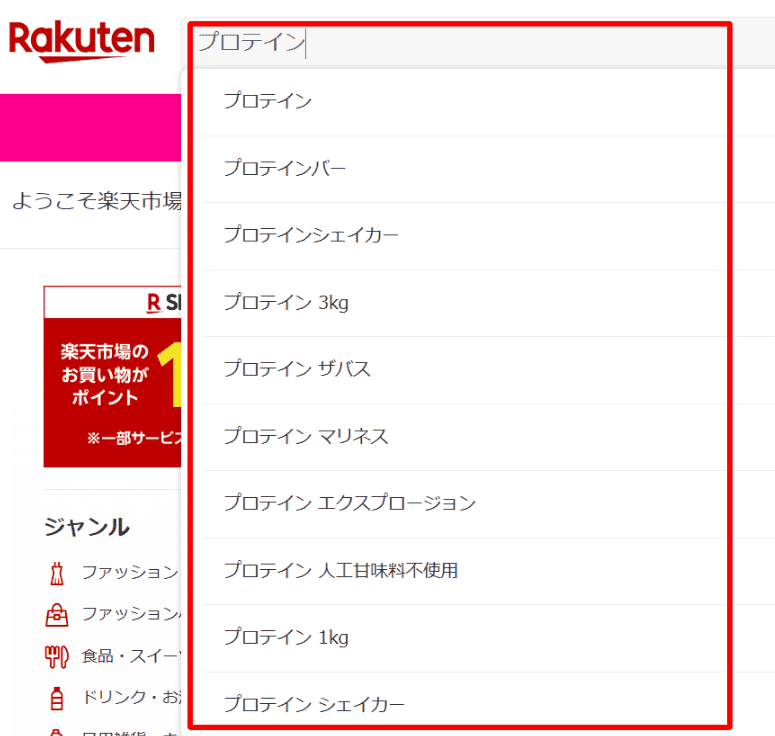 例えばAmazonで「プロテイン」と入力すると、「プロテイン 人工甘味料不使用」「プロテイン バー」「プロテイン シェイカー」など、購買意欲を喚起する商品関連ワードが表示されます。楽天市場でも同様に、人気商品や関連性の高い検索ワードが候補として提示されます。